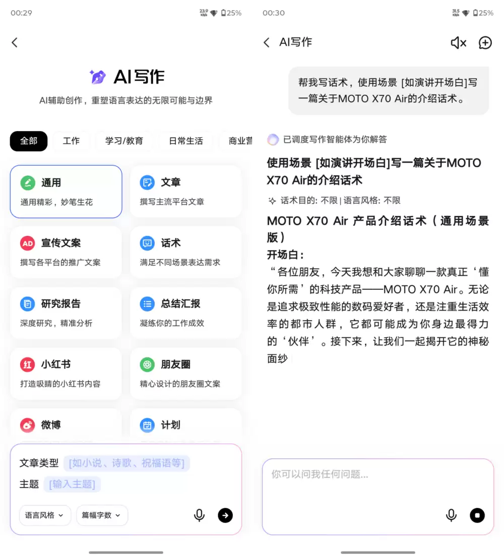 全新升级的天玑个人超级智能助手3.5,是联想moto X70 Air的智慧核心。它不仅实现了AI手机与AI PC的界面统一,更将AI功能深度融入日常场景,让交互更便捷、体验更个性化。