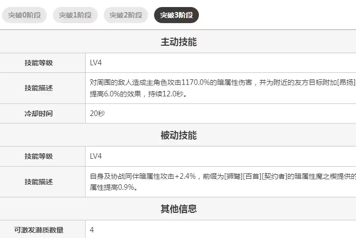 更难得的是,从突破零阶段到现阶段的三阶突破,黑曜艾尔芙始终保持着稳定的发挥。即使是初阶技能,也能展现出团队增益与高额伤害的双重效果。若想进一步提升实力,升级至4级后将会获得更出色的属性加成,完全不用担心后期乏力的问题。加上还有4个可以激发潜质的空位,对追求进阶的玩家而言有着充足的养成空间。不论是想强化辅助还是侧重输出,都能通过潜力培养打造出专属的作战风格。