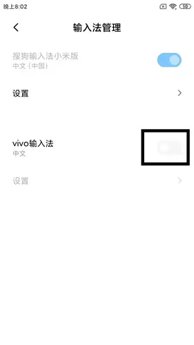 4. 现在只需要轻轻向右滑动“vivo输入法”旁边的开关,当按钮变成蓝色时就代表已经成功启用啦。