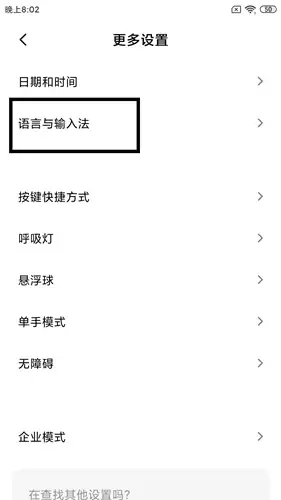 2. 在“更多设置”列表中,点击“语言与输入法”选项进入相应界面。