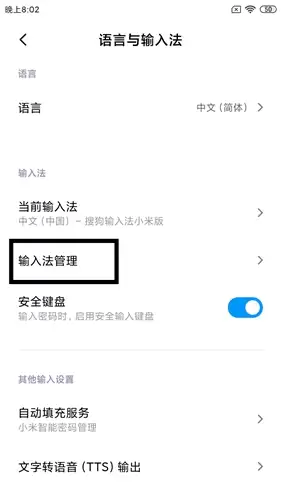 3. 接下来你会看到当前可用的输入方式,直接点击下方的“输入法管理”进入设置界面。