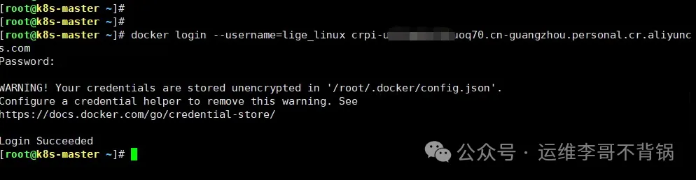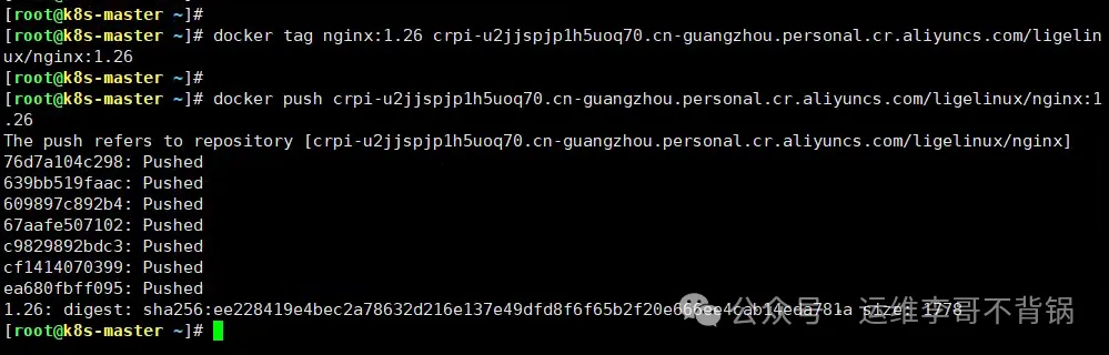 [root@k8s-master ~]# docker tag nginx:1.26 crpi-u2jjspjp1h5uoq70.cn-guangzhou.personal.cr.aliyuncs.com/ligelinux/nginx:1.26