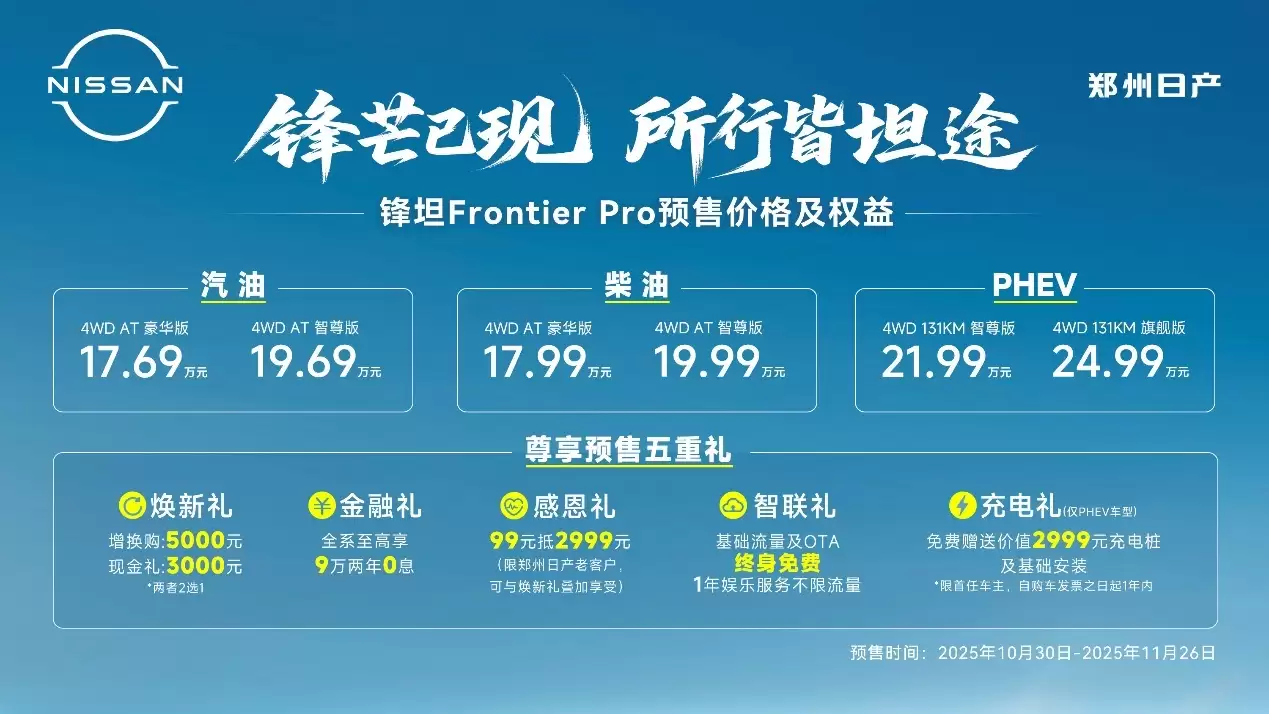 郑州日产全新硬派皮卡锐骐Frontier+Pro正式开启预售,此次共带来6款不同配置的车型,涵盖汽油版、柴油版及PHEV插电混动版本。新车预售价格区间为17.69万元至24.99万元,预售活动将持续至11月26日。作为日产家族的全新成员,锐骐秉承“硬核科技美学”的设计理念,将力量感与未来感完美融合,为硬派皮卡市场注入新的活力。