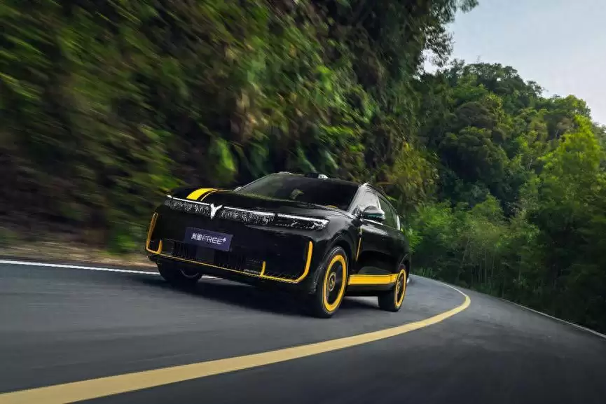 外观方面,岚图FREE+运动定制版通过“暗影流光”套件实现了视觉与功能的双重突破。车漆灵感源自夜空,静置时呈现深邃质感,行驶中则随光线变化折射出流星般的动态光影,较同级车型常见的单色车漆更具辨识度。细节处,亮黄色拉花贯穿引擎盖与车门下方,与前后保险杠、翼子板装饰及黄色卡钳形成呼应,既避免了全黑车身的沉闷感,又未陷入过度装饰的俗套。20英寸轮毂采用黑色辐条搭配流金色轮辋,转动时产生“流光环绕”效果,配合“峰回路转”尾翼与FREE+玄金尾标,强化了车辆的专属身份。这种设计在同价位车型中堪称独树一帜,甚至可媲美百万级跑车的视觉冲击力。