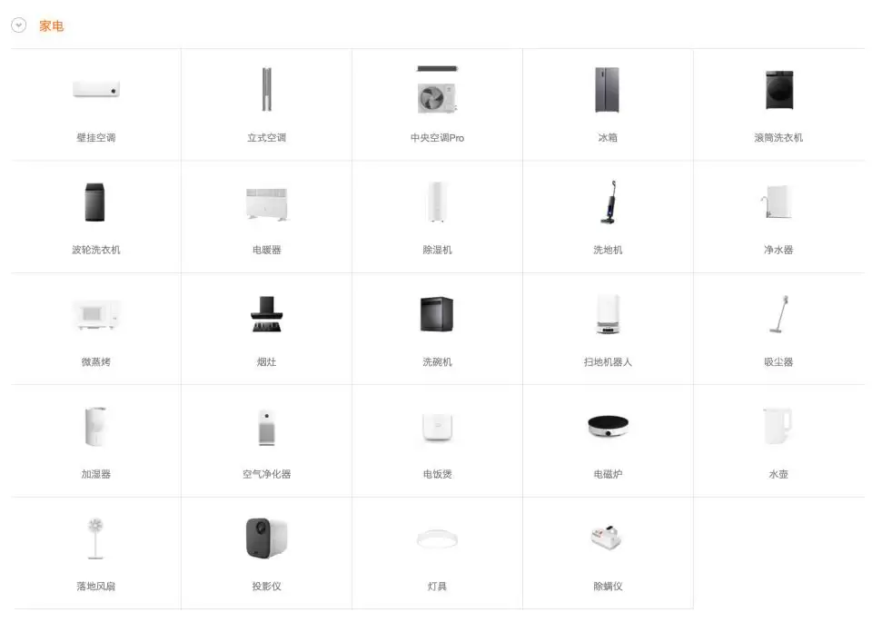 米家品牌已经覆盖的家电品类(来源:米家商城)