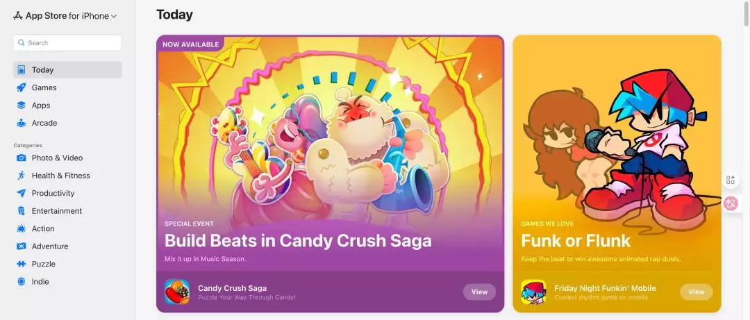 在这次更新之前,用户虽然能通过搜索引擎访问某个 App 的网页介绍页,但无法在网页端浏览 App Store 的分类或内容。在 MacBook 上点击 iOS 应用的网页链接时,会自动跳转并打开系统自带的 App Store 应用;但如果你是在 Windows 或安卓设备上访问,就会直接“卡死”在网页上,什么都做不了。