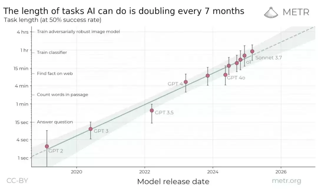 指数曲线下的震撼,AI「独立上班」的时间在翻倍