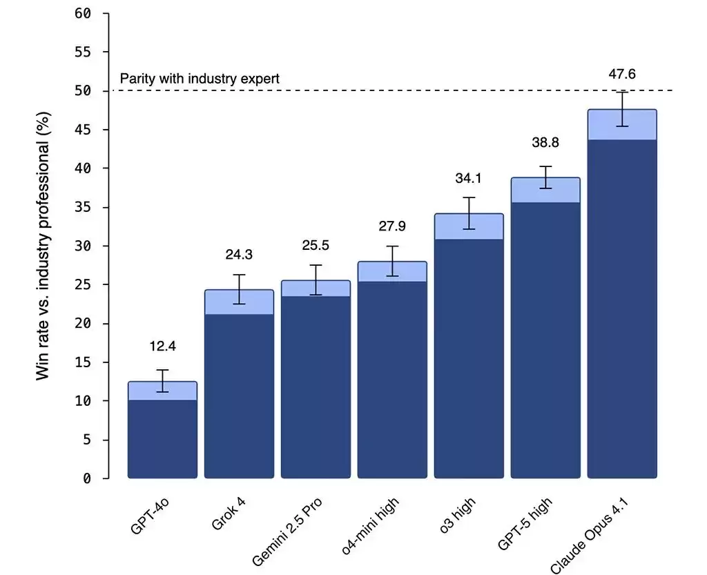 最新的结果显示,GPT-5在许多职业任务上已经接近人类水准。更令人意外的是,Claude Opus 4.1(发布时间甚至早于 GPT-5),在GDPval上的表现显著优于GPT-5,几乎追平了行业专家。