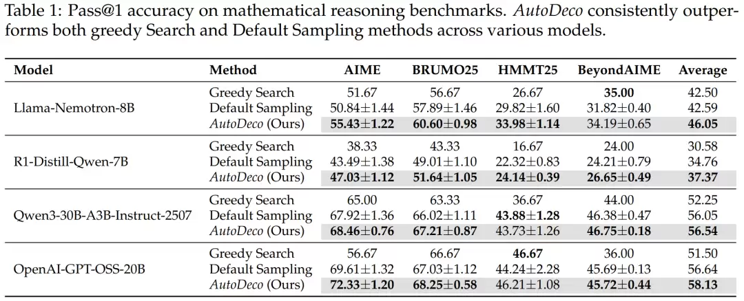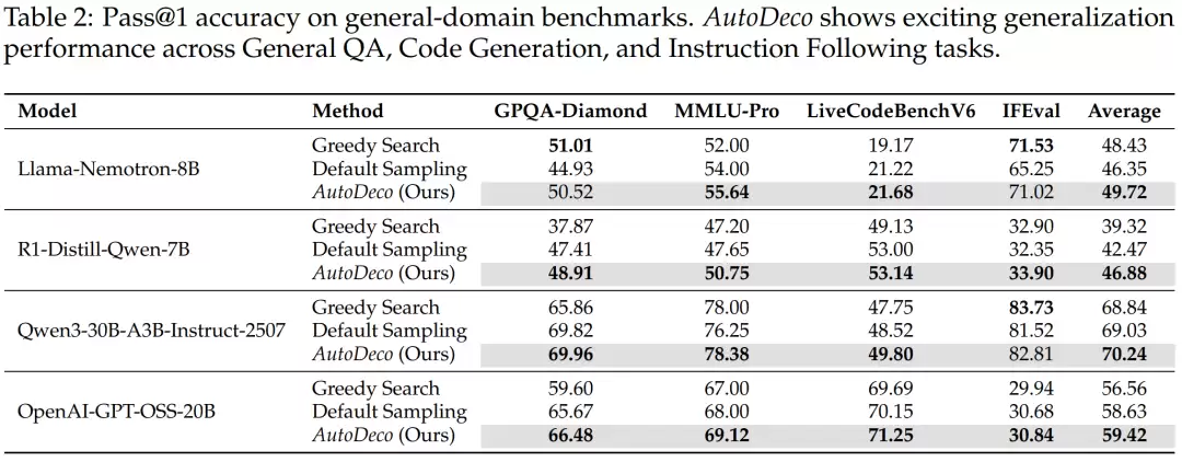 实验结果表明,AutoDeco不仅稳定超越了传统的Greedy Search和Default Sampling等基线方法,其性能甚至能媲美、乃至超越了利用测试集进行精细调优的"神谕"基线。
