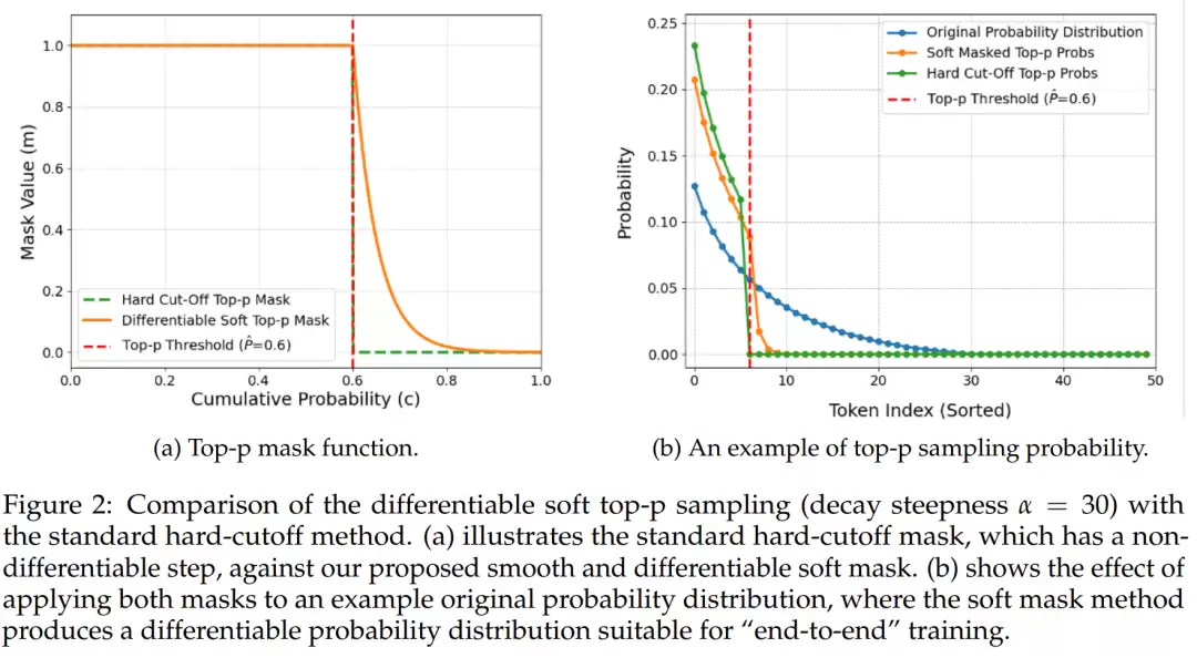 为此,团队提出了一种创新的、完全端到端的训练策略。他们设计了一种新颖的"软性top-p"机制,巧妙地替代了传统top-p采样中不可微分的"硬截断"操作。该方法分为三步: