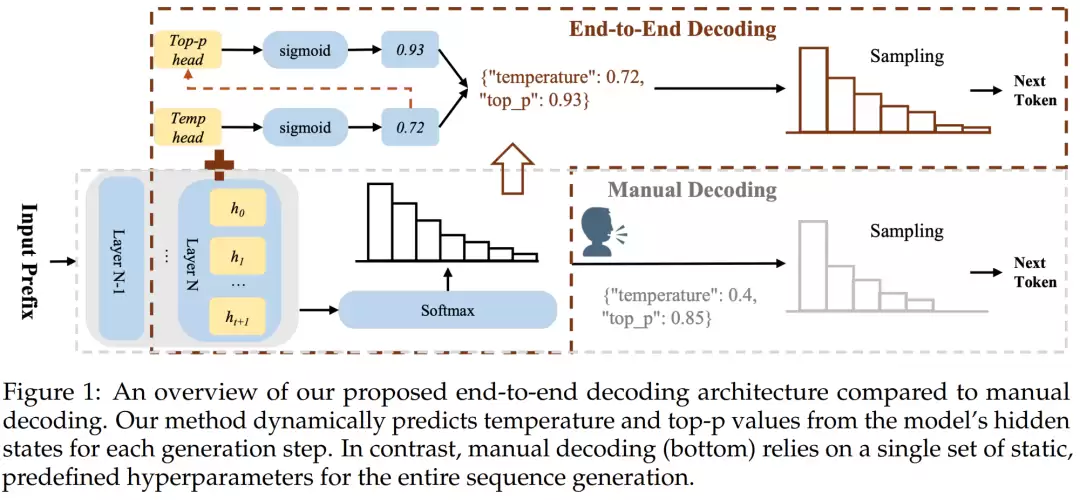 图4:AutoDeco(上)与传统手动解码(下)的对比。AutoDeco将解码参数的预测无缝集成到模型的前向传播中,实现了动态自适应调节。
