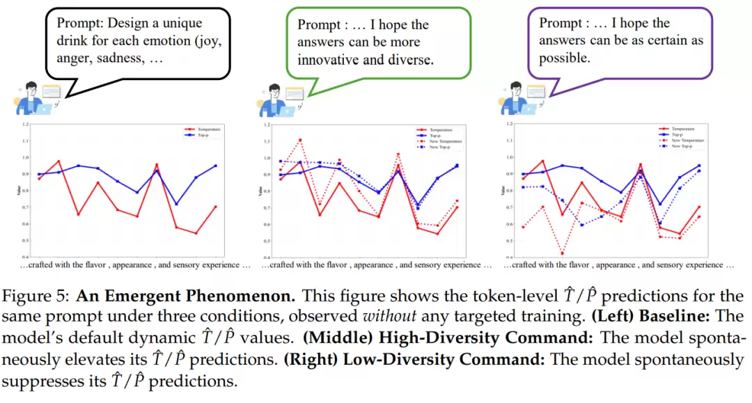 研究中最令人兴奋的发现之一,是AutoDeco涌现出的"通过自然语言控制解码"的能力。用户可以直接在prompt中通过自然语言下达指令,如"我希望答案更有创意",模型便能"听懂"并自主地调高其预测的temperature和top-p值,整个过程清晰可见。