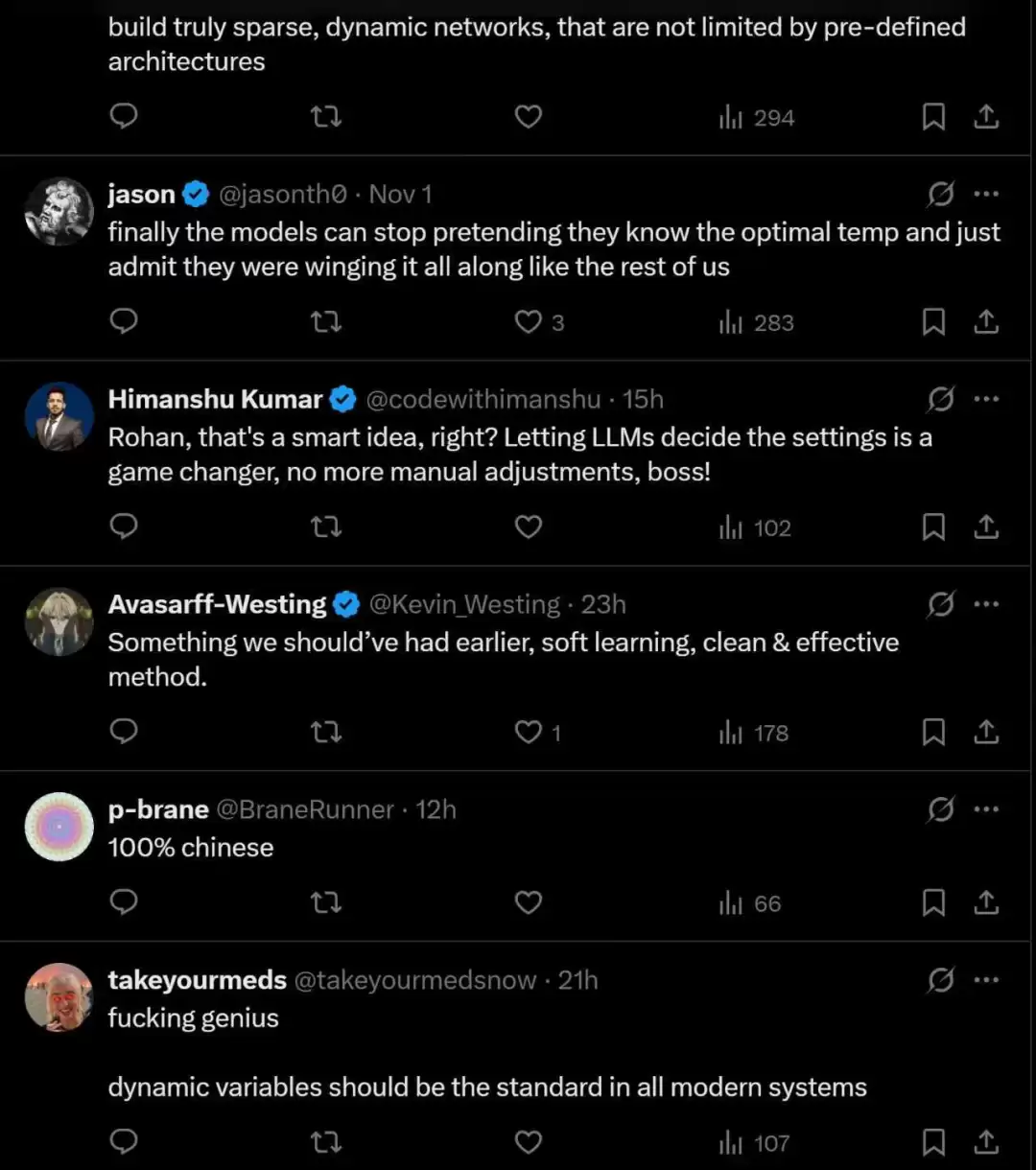 AutoDeco在发布后迅速吸引全球AI社区的关注,在Twitter等社交平台上引发了顶尖学者、开发者和企业家的广泛热议和高度评价。