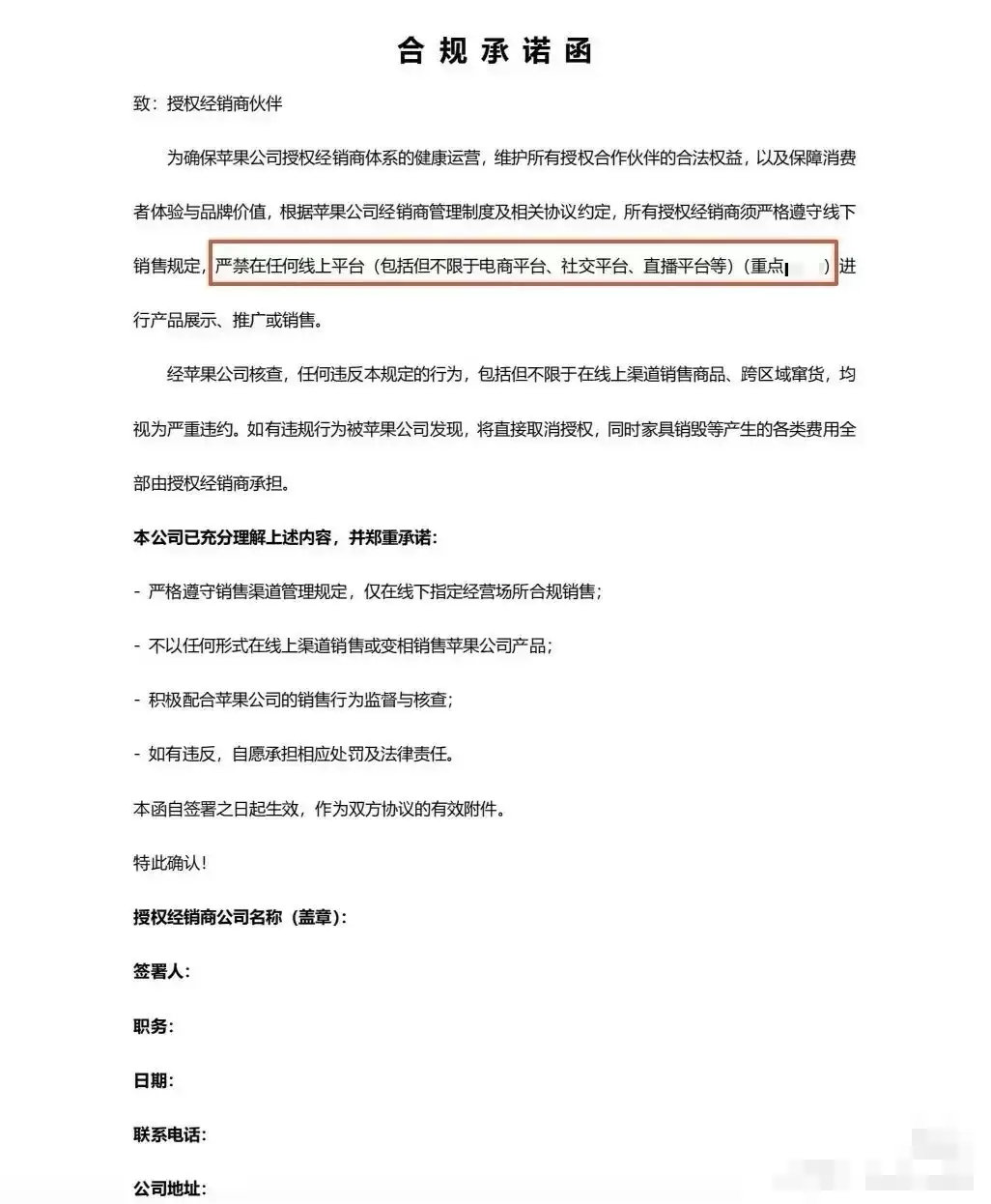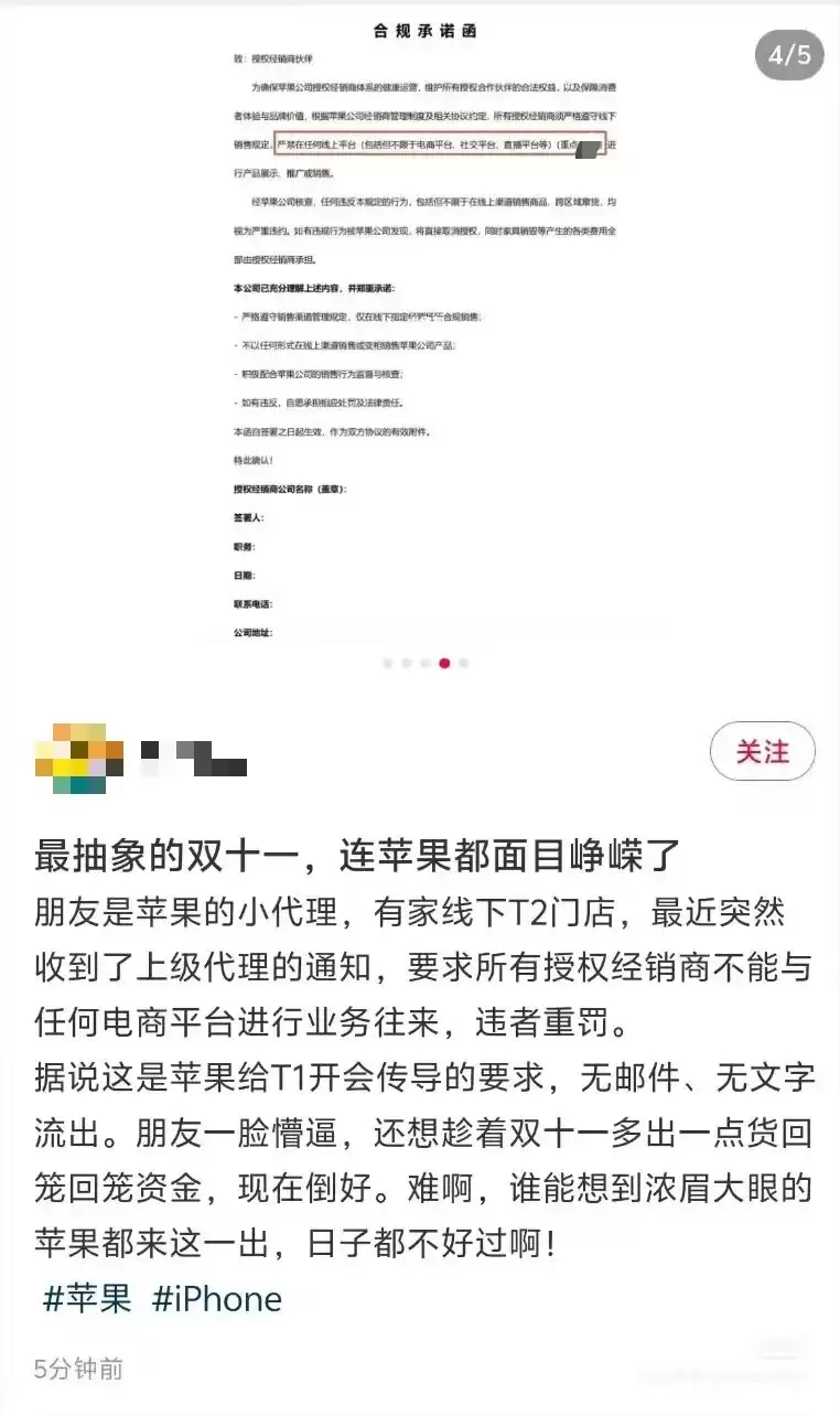 与此同时,网友还曝光了一份《合规承诺函》,要求苹果授权经销商承诺严格遵守销售渠道管理规定,仅限于在线下指定场所开展合规销售活动,不得以任何形式在线上渠道销售或变相销售苹果产品,并积极配合苹果公司对销售行为的监督与核查。