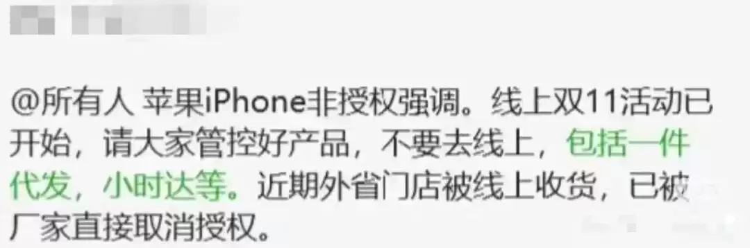 据了解,苹果此次是通过内部T1会议传达政策要求,并未通过邮件或书面形式对外公布。这项禁令的实施,对授权经销商的双11促销活动产生了直接影响,部分经销商原计划通过线上渠道增加销量以回笼资金,如今却只能严格遵守线下销售规定。