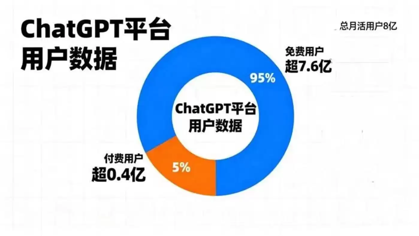 根据英国《金融时报》的披露,OpenAI的“年化经常性收入”约70%来自ChatGPT的订阅费。作为在全球范围内坐拥超8亿月活用户的平台,ChatGPT有足以让任何互联网公司艳羡的巨大流量池,然而在这片汪洋大海中,愿意掏钱付费的用户占比却仅为5%。