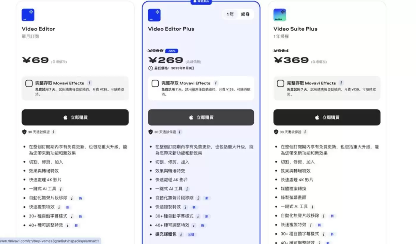剪映涨价之后,同类工具类产品也纷纷跟进,如Movavi Video Editor就针对国内用户推出促销价格69元/月的订阅制,其核心卖点正是一键式AI工具,包括AI自动字幕生成等功能。