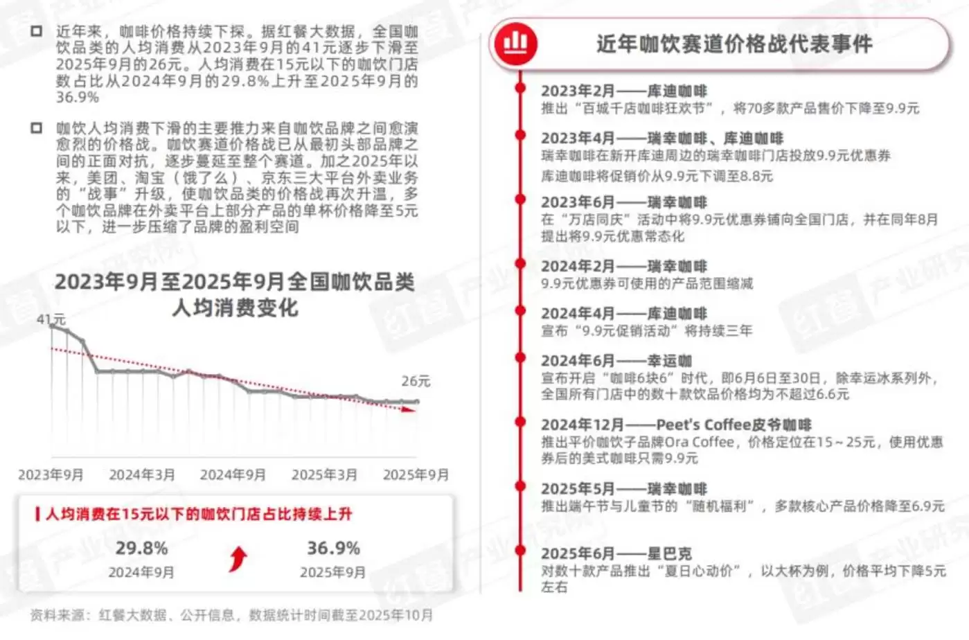 近年来,咖啡价格持续下探。据红餐大数据,全国咖饮品类的人均消费从2024年9月的41元逐步下滑至2025年9月的26元。人均消费在15元以下的咖饮门店数占比从2024年9月的29.8%上升至2025年9月的36.9%。