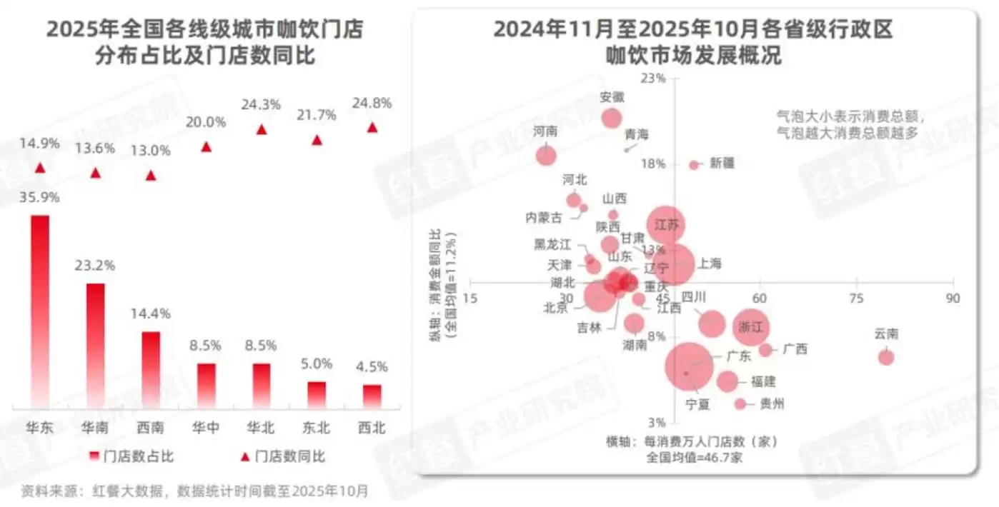 区域分布方面,据红餐大数据,华东、华南、西南是咖饮门店数排名前三的区域,占比分别达到35.9%、23.2%以及14.4%。值得注意的是,尽管华中、华北、东北、西北区域的咖饮门店数占比均不足10%,但这些区域的咖饮门店数量增长较快,门店数同比均超过20%。