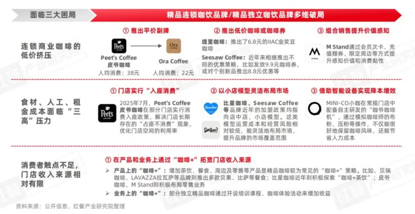 为应对这些挑战,不少精品咖饮品牌积极寻求破局之道。比如,通过推出平价副牌、低价咖啡券等方式提高性价比;或以小店模型、智能设备等手段降本增效;亦或通过“咖啡+”的模式实现多元业态延伸及拓宽消费场景。整体来看,精品咖啡正从高端化走向多元化、轻量化与场景化的进化阶段。