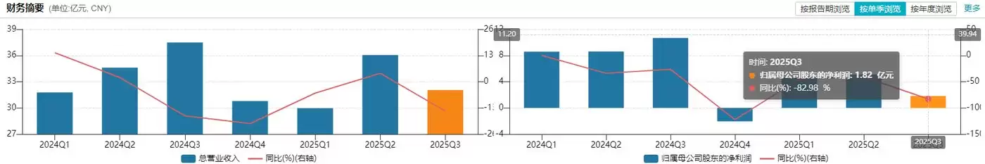公司在今年前三季度实现营业收入98.07亿元,同比微降5.6%。不过,归属于上市公司股东的净利润却遭遇"腰斩",同比骤降58.23%至11.65亿元。盈利能力的恶化速度,显然远超营收端的收缩幅度。其中,第三季度单季度的营业收入同比下降14.55%至32.04亿元,而归母净利润更是锐减82.98%,仅录得1.82亿元。