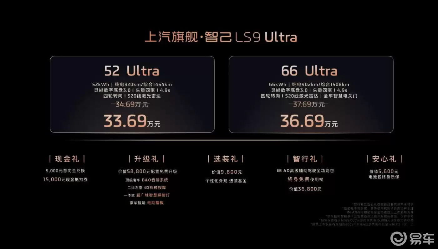 上汽集团旗下旗舰车型智己LS9正式开启全球预售,本次首发推出52+Ultra版与66+Ultra版两款超级增程车型,预售权益价分别为33.69万元与36.69万元。作为凝聚上汽70年造车精髓的集大成之作,这款大六座SUV凭借“双跨代科技+双智能创新”的硬核实力,正在重新定义30万级市场的价值标杆。