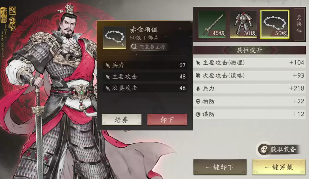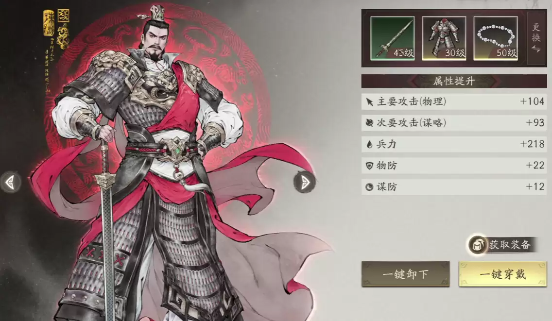 游戏内还设有武将专属装备,比如关羽的青龙偃月刀。当主将持有专属装备时,不仅能提升技能伤害倍率,还能强化角色各项属性值。