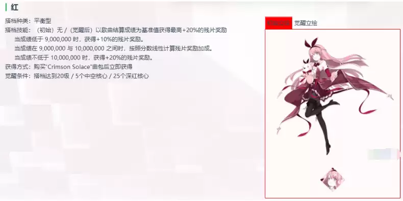 购买相应曲包后,可以直接获取红这个角色。一般情况下,大家可以在世界末日第二章中获得她。后期当她的搭档等级达到20级时,可以使用中控核心与深红核心这两种材料进行觉醒。通常情况下,碎片奖励加成的基础数值为10%,而红作为提升奖励效果的角色,能达到20%的性价比还是非常高的。当玩家分数在900万到1000万之间时,系统会根据分数百分比给予不同的线性奖励加成。例如获得980万分时,会有18%的奖励加成。由此可见她的技能生效效果存在一个提升区间,并非初始就是20%的固定数值。