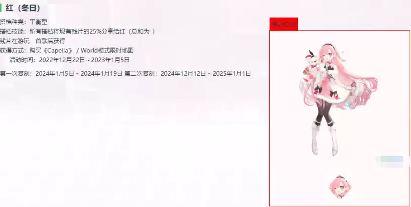 红在后期还有一个冬日形态,这个形态的外观设计发生了显著变化。比如她裙摆增加了更多绒边装饰,穿上了长靴,手中的小熊也改变了着装。但从整体造型来看,在融入白色元素后,大部分红色设定依然得以保留。不过裙子的颜色变成了类似发色的粉红色调。这个冬日形态的红其实类似于皮肤设定,除了外观变化之外,不会带来其他属性数值方面的改变。