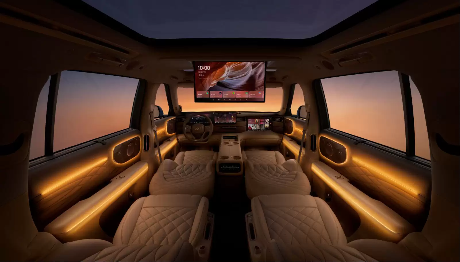 内饰空间以头等舱为灵感,大量真皮材质与高级座椅共同营造豪华氛围。非对称布局的中控台配备27.1英寸5K双联屏,负责车辆信息与多媒体显示。副驾驶侧嵌入15.6英寸3K娱乐屏,提供丰富功能体验。第二排配备两张零重力独立座椅,搭载21.5英寸4K吸顶屏,NAPPA真皮材质与4D机械按摩功能彰显诚意。B&O音响系统总功率达3472W,25个扬声器带来沉浸式视听享受。