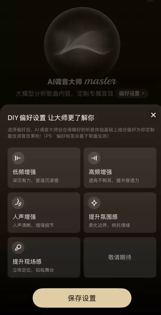 这项功能的核心在于AI大模型对音频内容的深度理解。系统会实时分析歌曲的旋律走向、节奏变化和声场宽度等特征,自动匹配专属音效参数,确保每首作品都能展现最动人的听觉质感。比如播放古典乐章时,AI会突出弦乐声部的层次细节;而当电子音乐响起,系统则会强化低频律动的冲击力。