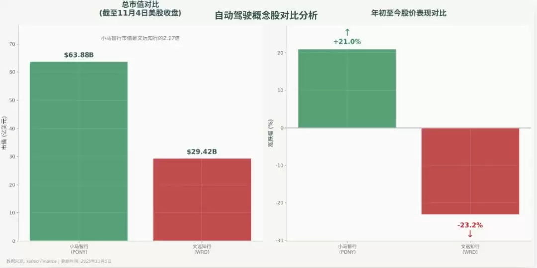 截至11月4日,小马智行总市值达到63.88亿美元,约为文远知行29.42亿美元市值的2倍以上。今年以来,小马智行累计涨幅超过21.0%,而文远知行的股价则下跌了23.2%。