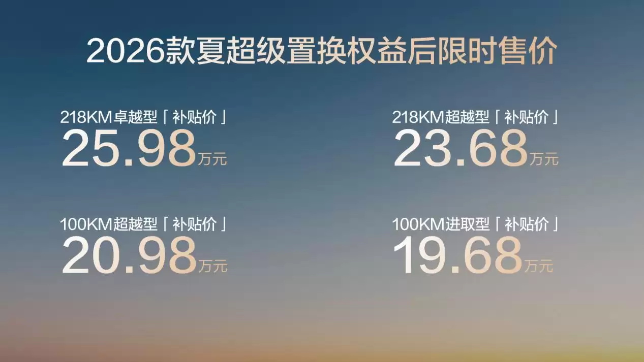 2026款夏的改款,核心在于"纠偏"。其限时起售价降至19.68万元,较老款直降5万元,并将1万元置换补贴直接纳入定价体系,形成"人人可享"的普惠政策。这一调整不仅显著降低了购车门槛,更通过价格透明化增强了市场竞争力。