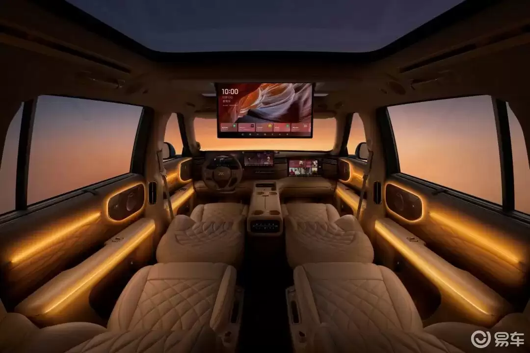 内饰融合科技感与实用主义,27.1英寸双联屏与15.6英寸3K MiniLED副驾娱乐屏共同构筑沉浸式交互空间,空调出风口与中控台一体化设计提升整体质感。中央扶手区集成无线充电模块与杯架,下方悬浮式储物空间可轻松容纳随身物品。配置方面,车载冰箱、4D机械按摩座椅、B&O音响系统、520线激光雷达及英伟达Thor芯片等装备均达到行业领先水准。