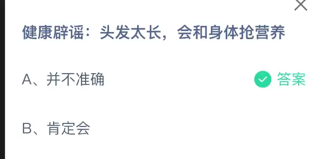 健康辟谣:头发太长真的会和身体抢营养吗?支付宝小鸡课堂开课啦!每天花一分钟答题赚饲料,喂喂小鸡就能献爱心啦,轻松又有意义!2025年11月6日蚂蚁庄园的小鸡课堂题目正确答案是【并不准确】,头发太长并不会和身体抢营养,这个说法并不成立。
