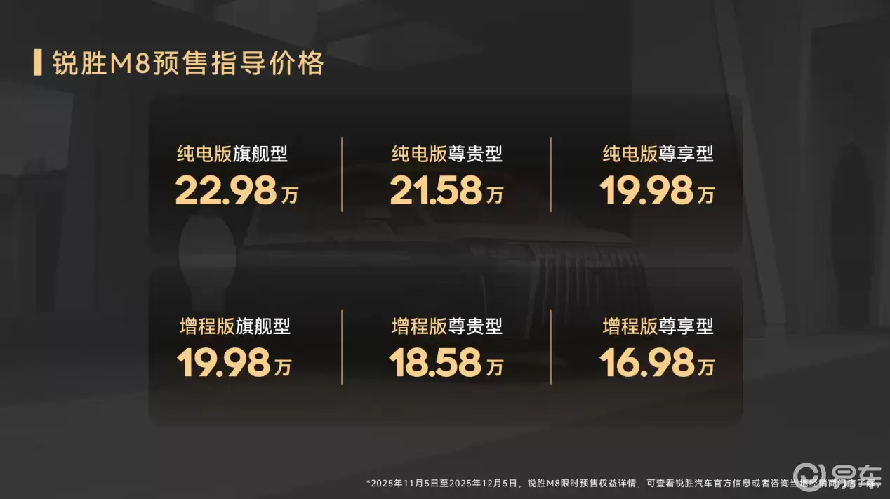 近日,北京汽车制造厂旗下的独立MPV品牌锐胜汽车正式开启了旗下首款车型——锐胜M8的预售活动。这款定位为大型MPV的新车,以16.98万元起的增程版预售价和19.98万元起的纯电动版预售价,为消费者带来了极具性价比的购车选择。在当前以30万元级别MPV为主导的市场环境下,锐胜M8凭借着亲民的定价与越级的产品实力,有望重塑这一细分市场的竞争格局。