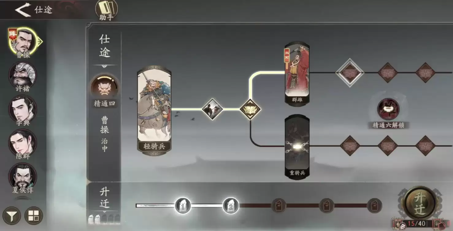 每一位武将的路线都可以逐步解锁。倘若玩家在游戏后期调整阵容,例如选择走骑兵流派,也可以直接把曹操的授勋路线调整为骑兵,并在解锁对应路线后,进一步掌握骑兵的训练技能——比如攻击训练、防御训练、兵力训练,甚至包括特殊技能“铁骑驱驰”。