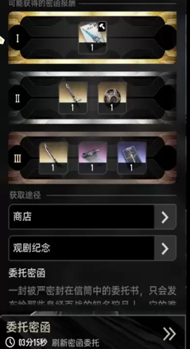 获得武器密函后,在委托界面选择对应密函即可定向刷取。这里可以看到通关密函后可能出现的三档奖励: