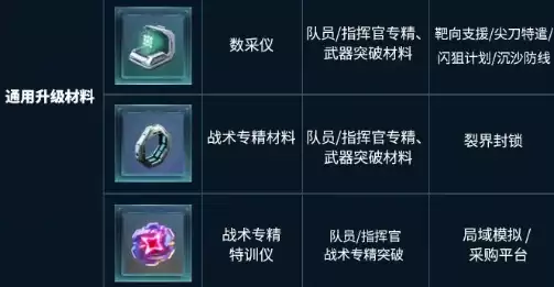 武器与模组养成道具可以通过武器兑换币获取,还有模组数据单元,主要依赖深红武装副本。深红武装每周打三次,不仅能获得两个道具,还能产出活性合金锻料。这可是医疗和工程专精提升的关键材料,必须优先刷满。专精与突破材料方面,不同职业的队员所需材料有所区别,千万不要搞混。实训补给箱和实训仪都可以通过刷副本获取,队员以及指挥官战术专精的突破全靠它。