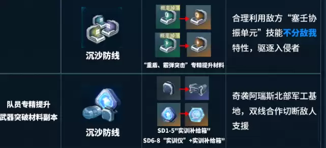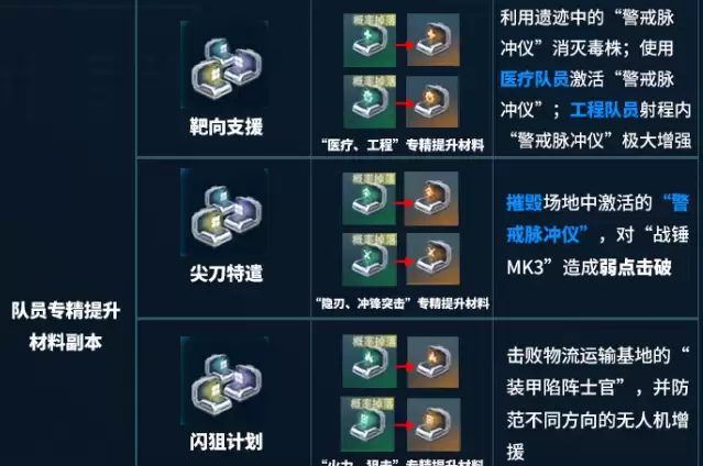 此外,深红武装副本也值得重点关注,这里是培养高级武器的必经之路。主要产出材料包括武器兑换币、模组数据单元以及活性合金锻料。前两者用于兑换和刷新武器模组词条,后者则是工程职业提升专精的必备素材。想要打造强力武器,或是培养医疗队员,这个副本务必刷满。接下来是职业专精材料本,产出完全对应各自职业,千万不要搞混。靶向支援副本可以获取影刃职业,还有冲锋突击职业的专精提升材料。