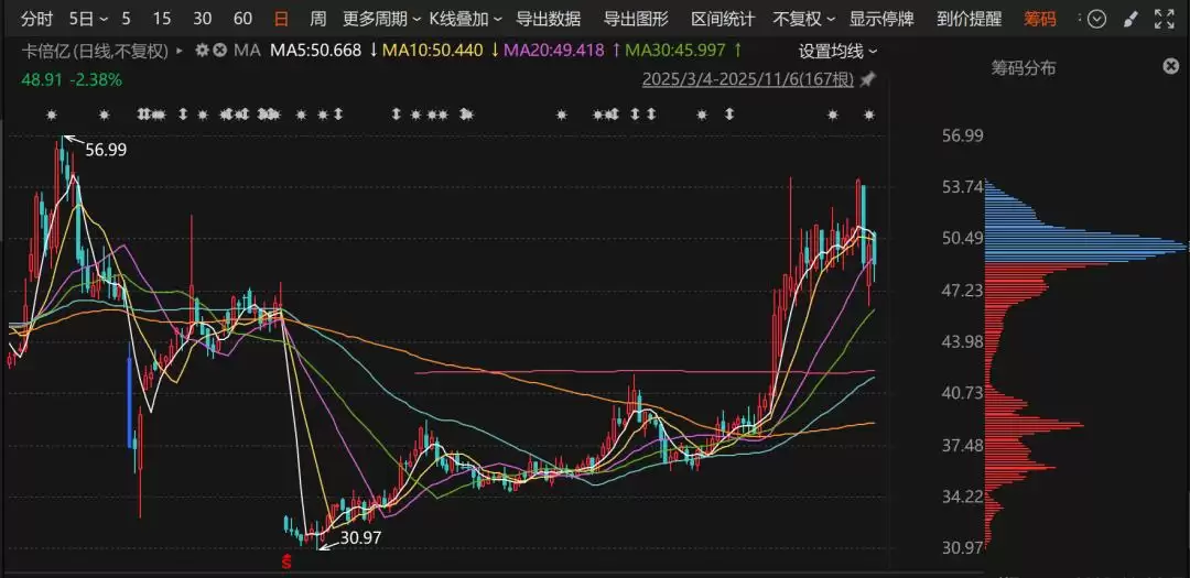 11月6日,截至收盘,卡倍亿涨0.34%,报50.27元/股,总市值94.60亿元,年内股价涨超50%。