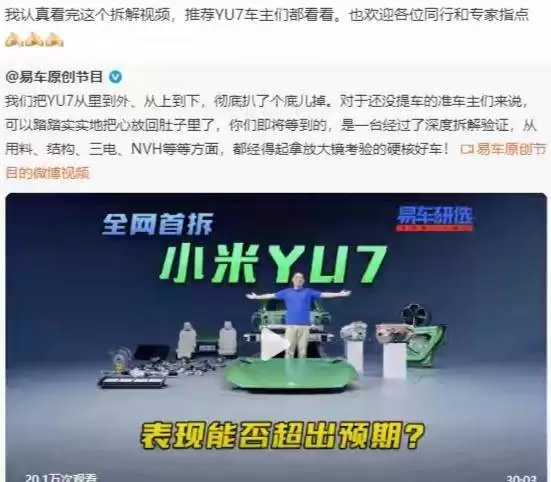 一辆崭新亮相的小米YU7在镜头前被完整拆解,从车身骨架到电池护甲,从域控模块到电子元件,每个细节都被放大呈现。这场由易车原创节目与小米汽车联合发起的直播拆解,不仅冲上微博热搜,更引发了公众对智能汽车安全与品质的深度探讨。