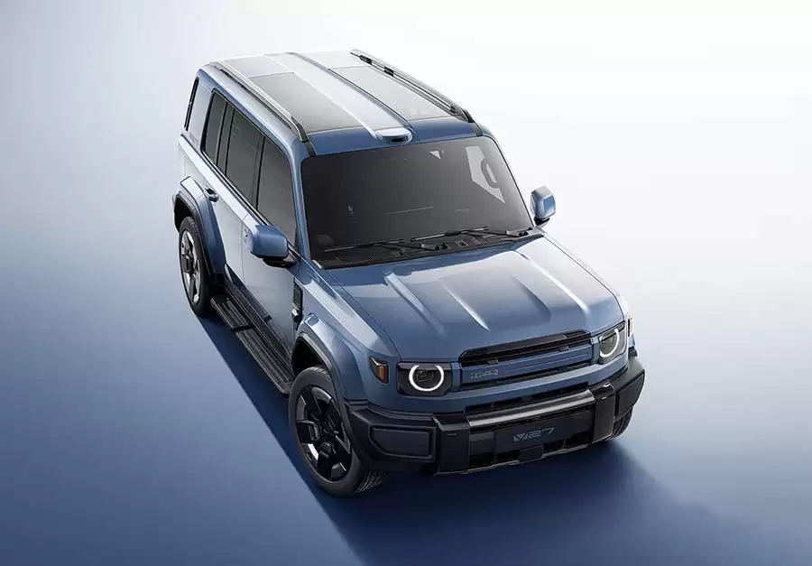外观设计上,iCAR V27采用全新的设计语言,在保留硬派越野车经典元素的同时,融入了更具先锋感的时尚细节。前脸部分,窄幅式格栅与方形灯腔搭配环形灯带,营造出独特的视觉张力;前包围处的银色护板则进一步强化了车辆的越野气场。车身侧面线条平直硬朗,整体造型方正魁梧,延续了iCAR V23车型的盲窗设计、车头侧面集成NFC模块和摄像头的"机能模块"等家族化设计元素。