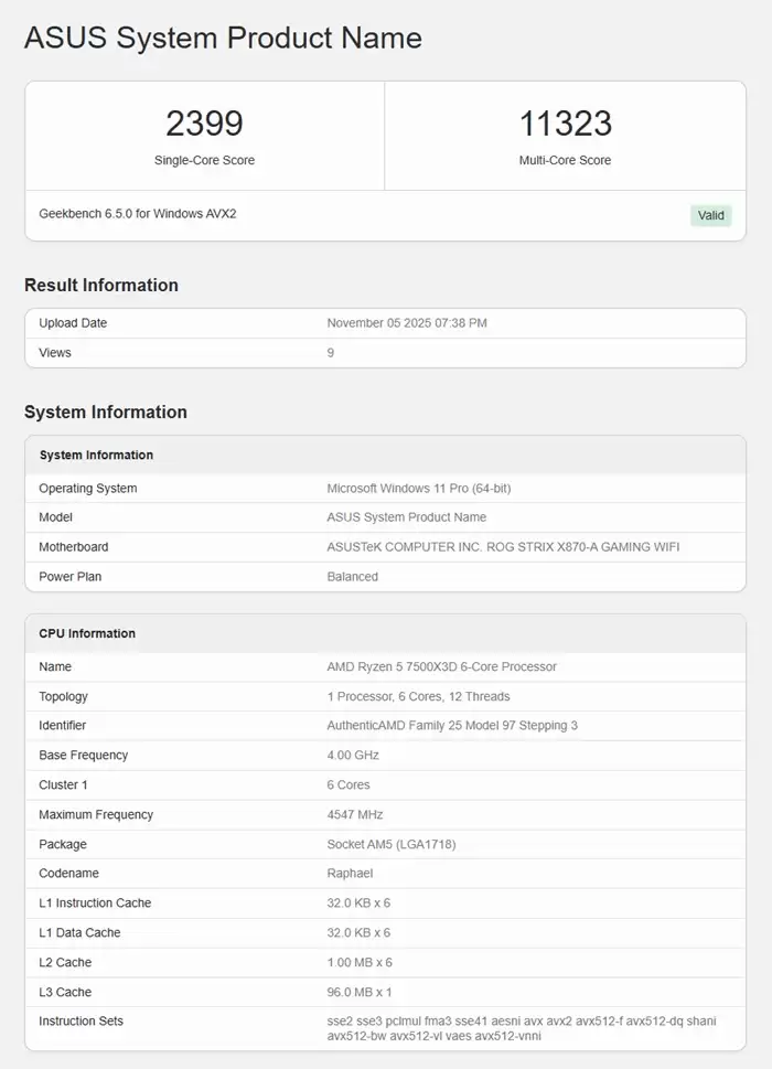 性能测试结果显示,Ryzen 5 7500X3D在Geekbench中的单核得分为2399分,多核得分为11323分。与同为6核12线程的Ryzen 5 7600X3D(单核2603分/多核12343分)相比,其单核与多核性能均略逊一筹,这与两者的频率差异相符。不过可以预见,在更依赖大容量缓存的实际游戏表现上,二者之间的差距很可能微乎其微。