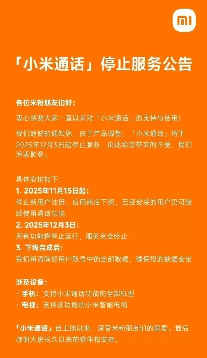 小米通话服务2025年12月终止,用户数据将全面清理