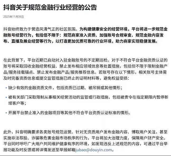 11月7日,抖音平台发布一则新规,自11月6日起将进一步加强金融类账号及内容的经营规范。为营造更加健康、安全的网络交易环境,平台将从多个维度加强对金融账号经营行为的管理,具体措施包括:严格把控商家入驻资质、加强账号合规审查、规范金融类内容发布,并进一步规范直播间及线下展业等经营行为。