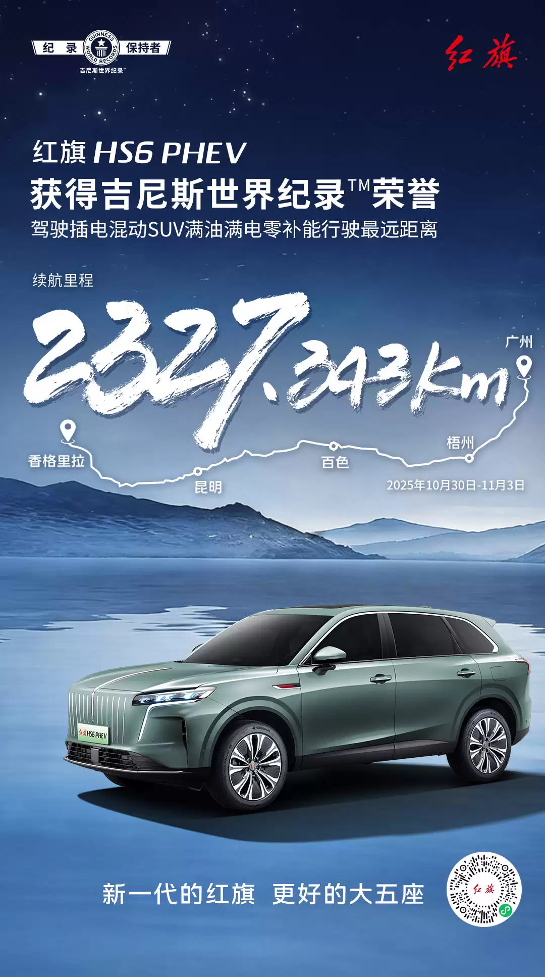 红旗HS6 PHEV以一场跨越2000公里的极限挑战,在新能SUV领域投下重磅震撼。这款大五座旗舰车型从香格里拉启程,满油满电直抵广州,最终以2327.343公里的成绩刷新吉尼斯世界纪录,成为"驾驶插电混动量产SUV满油满电零补能行驶最远距离"的保持者。这一壮举不仅超越了传统认知中SUV的续舫极限,更以量产交付标准车型完成挑战,车内座椅加热、通风等舒适配置全程开启,将真实使用场景纳入测试范畴。
