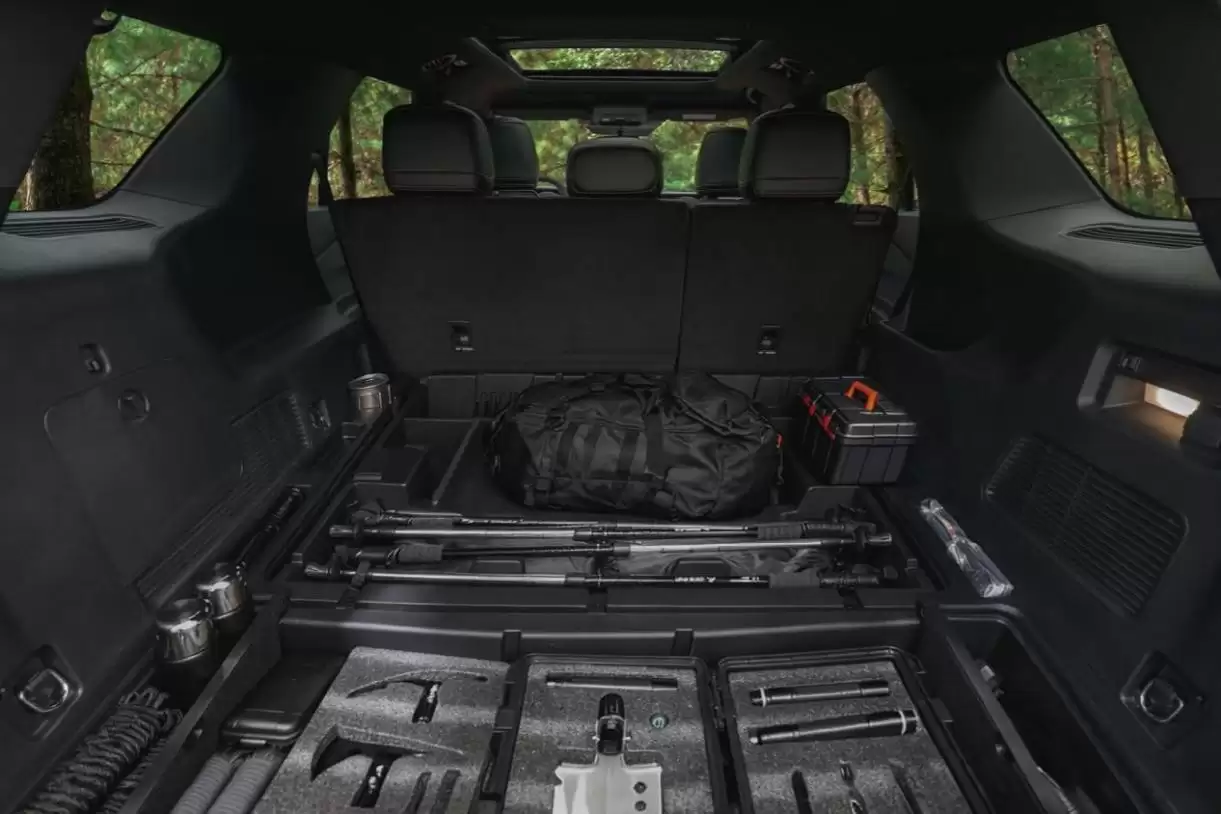 昆仑穿越版以五座布局直击户外储物痛点。常规状态下1505L的后备箱容积,可轻松容纳滑雪板、自行车等大件装备;第二排放倒后扩展至2487L的纯平空间,配合15个精细化储物格与可移动挡板设计,实现物品分类管理的灵活性。新增的置物板下隐藏储物盒额外拓展近100L空间,让帐篷、炊具等零散装备也能有序收纳。