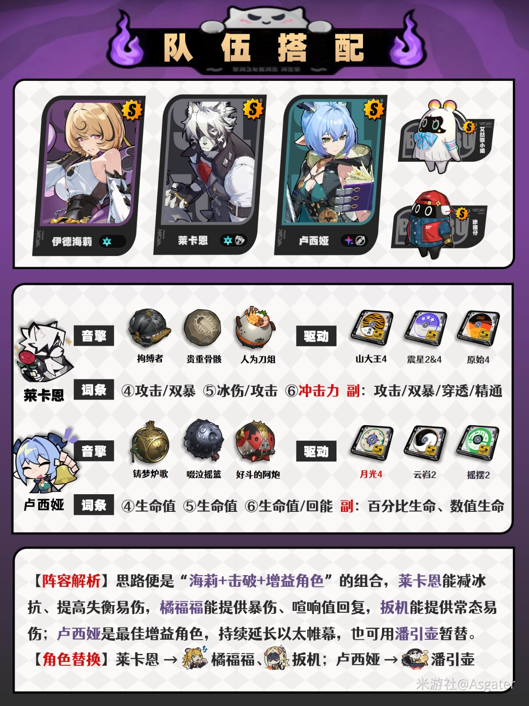 ① 卢西妲、潘引瓶均未拥有时,可依靠"攻击力转贯穿力"机制来选择攻击力辅助,如嘉音、凯撒、露西、苍角等。