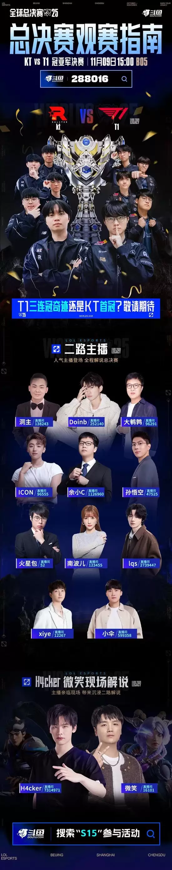 历经入围赛的激烈角逐、瑞士轮的血腥拼杀以及淘汰赛的终极考验,17支英雄联盟顶尖战队终于迎来了激动人心的加冕之战。11月9日,LCK赛区的两大豪门战队T1与KT将在成都展开终极对决,争夺2025英雄联盟全球总决赛(S15)的冠军宝座。作为国内领先的游戏直播平台,斗鱼将全程呈现精彩赛事,并集结平台多位人气主播与职业选手组成二路解说天团,为用户带来多元化的观赛体验。用户可通过主直播间【288016】锁定赛事最新动态。